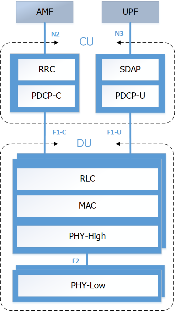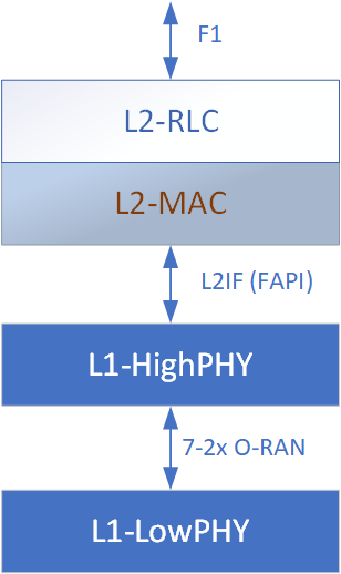 На рисунке ниже показаны интерфейсы F1 и FAPI, посредством которых реализуется обмен данными между централизованным модулем CU и распределенным модулем DU, а также между уровнями стека протоколов L2 и L1 внутри распределенного модуля DU.