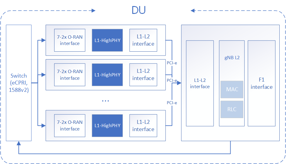 Функции ПО L1-HighPHY/L2 реализуются в распределенном модуле (gNB-DU), высокоуровневая архитектура которого показана на рисунке ниже.